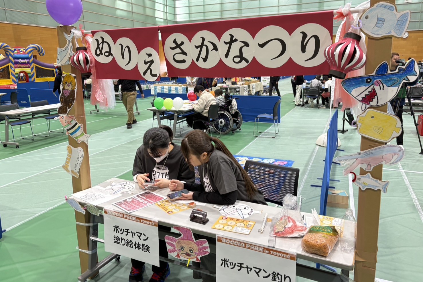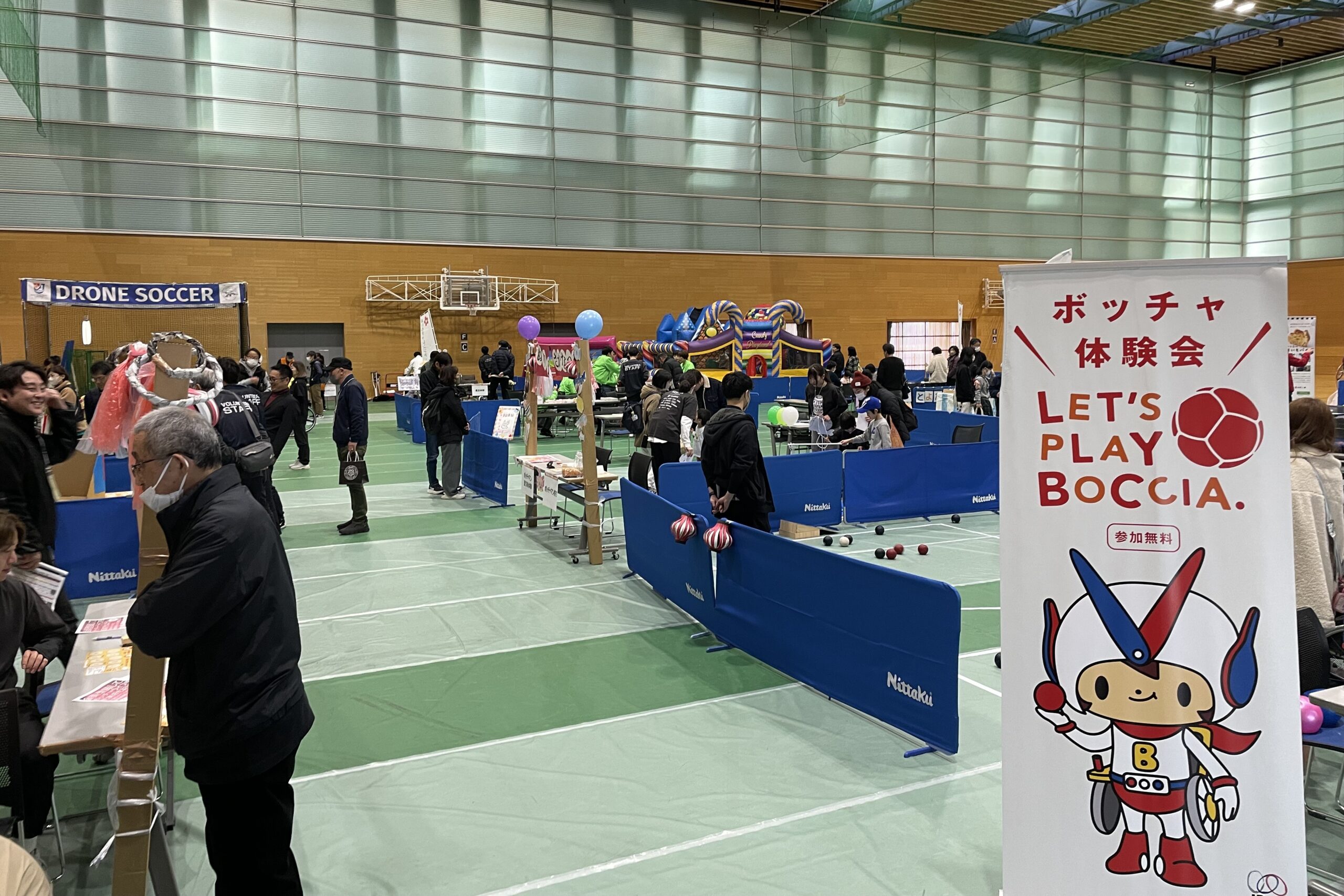 また、サブホールでは多くのアクティビティやスポーツ体験ができる「BOCCIA PARK in TOYOTA」も実施されました。連日、子どもを中心に多数の来場者でにぎわい、大会全体を盛り上げる企画となりました。パラネットは事前準備からサポートに入り、大会当日は学生スタッフや地域ボランティア、県協会の方々と協力し、大会運営を円滑に進めるための一助を担いました。