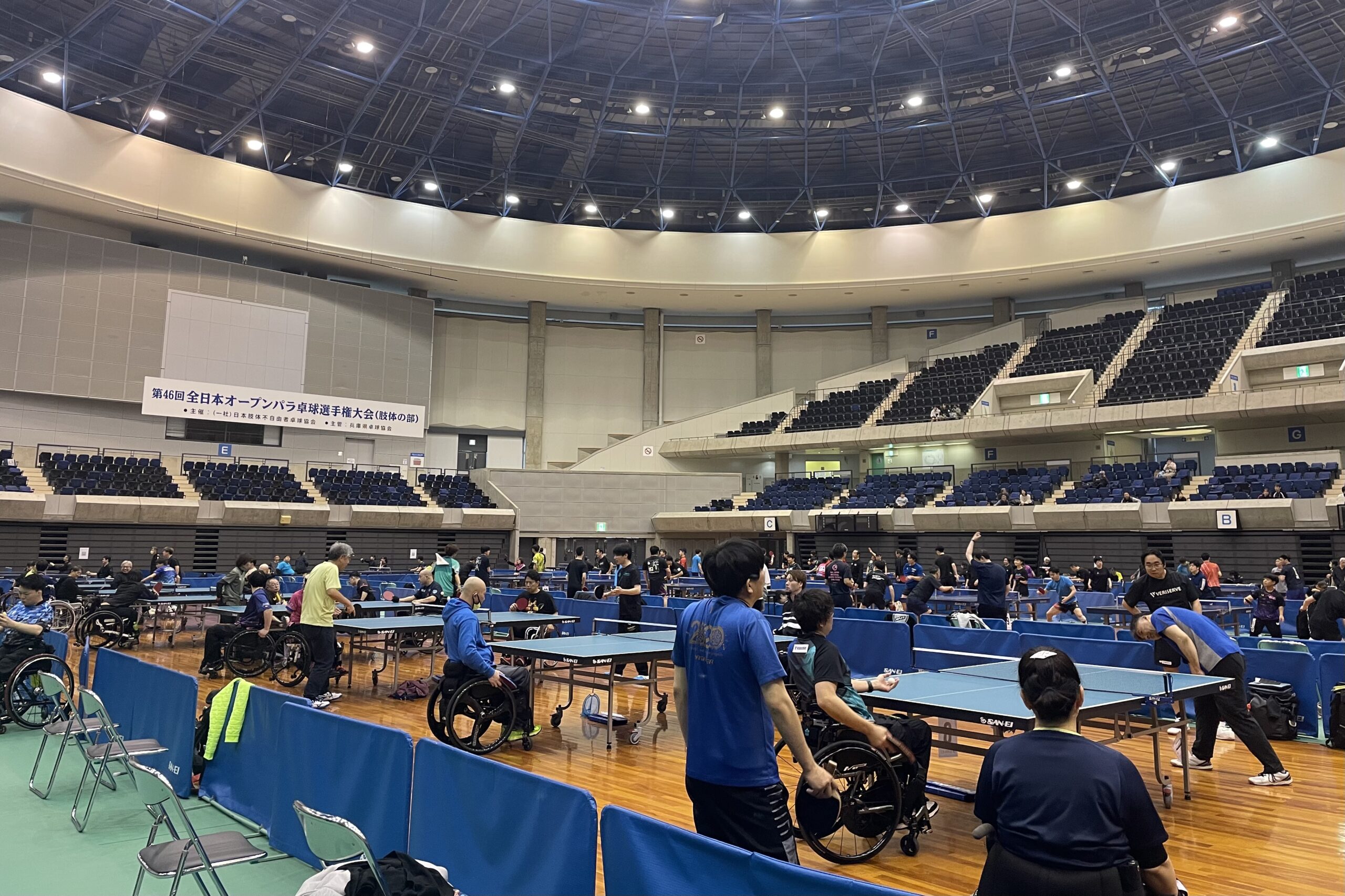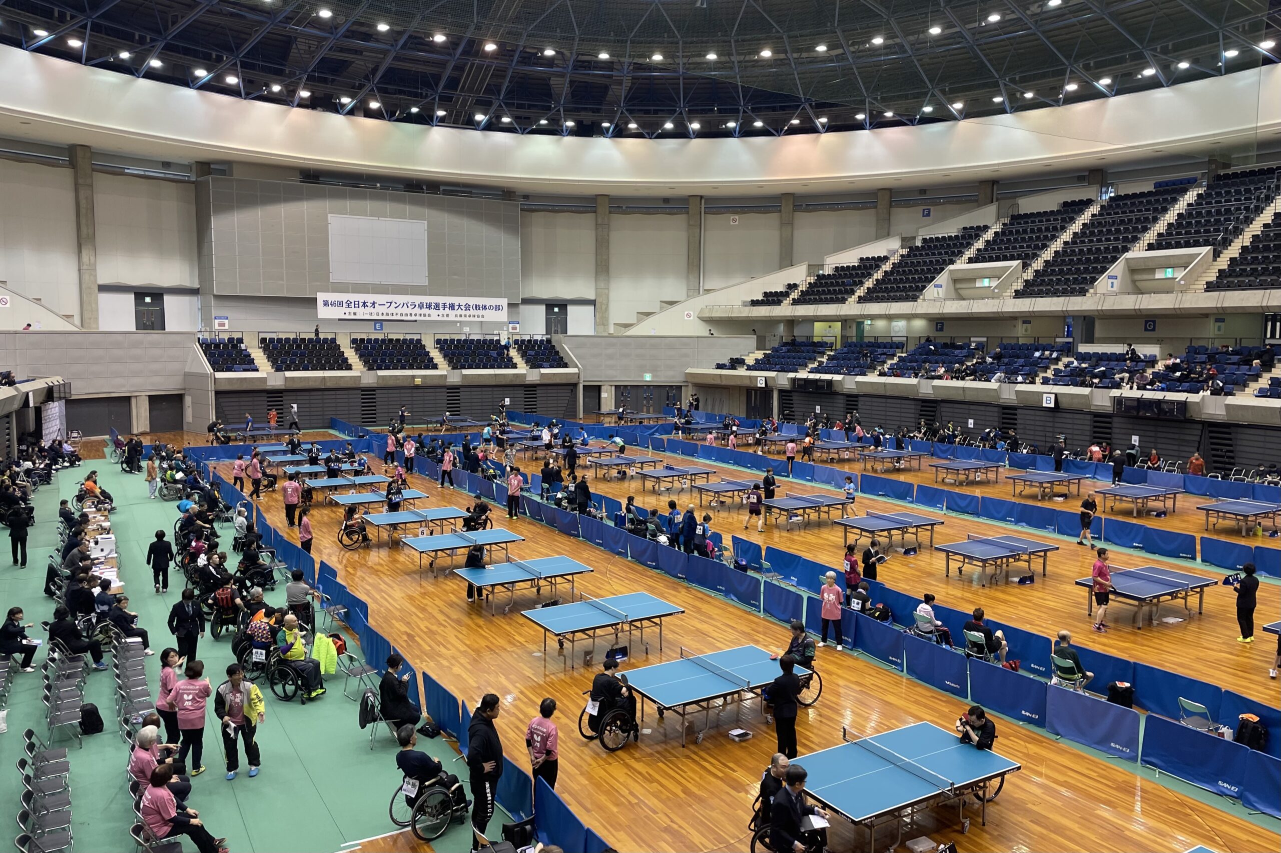立位・車いす使用の部などといった特定の区分以外、障がいのクラス関係なく戦う「全日本オープンパラ卓球選手権大会(肢体の部)」が今年もグリーンアリーナ神戸で開催されました。今年度は新たに、オーバーシックスティ(60歳以上)部門が新設。部門が増えたことにより、昨年に増してにぎやかな大会となりました。立位男子上級クラス(G1)では、岩渕幸洋選手が7年ぶりに優勝。車いす女子上級クラス(G1)の決勝戦は昨年と同様の対戦カード、別所キミヱ選手 – 宮﨑恵菜選手となり、今年度は宮﨑選手がリベンジに成功し初優勝を果たしました。