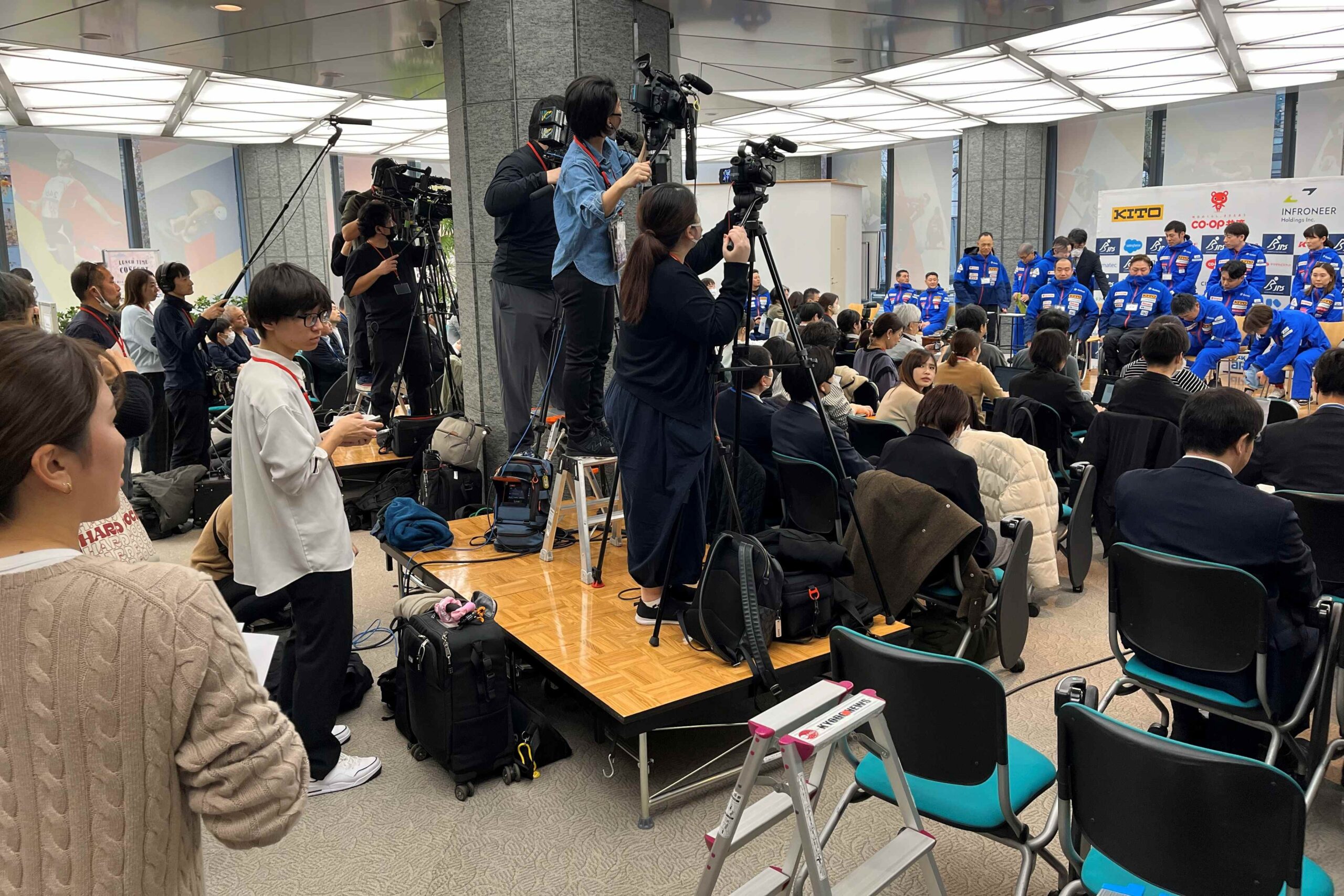 2025-26のシーズンキックオフを迎え、椎名茂会長、大日方邦子強化本部長をはじめ、3名の強化委員、4種目・18名の代表選手が意気込みや現在の調整方法を、約20社50名ほどの報道陣に一人ずつ語りました。